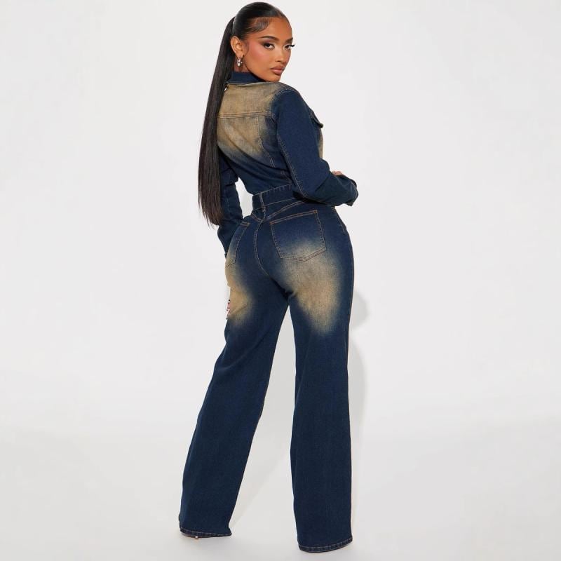 オールインワン レディース デニム 長袖 ウエストゴム コットン ストレッチ ウォッシュ加工 レトロ ヴィンテージ ストレートロング丈 ストリートカジュアル ダークブルー