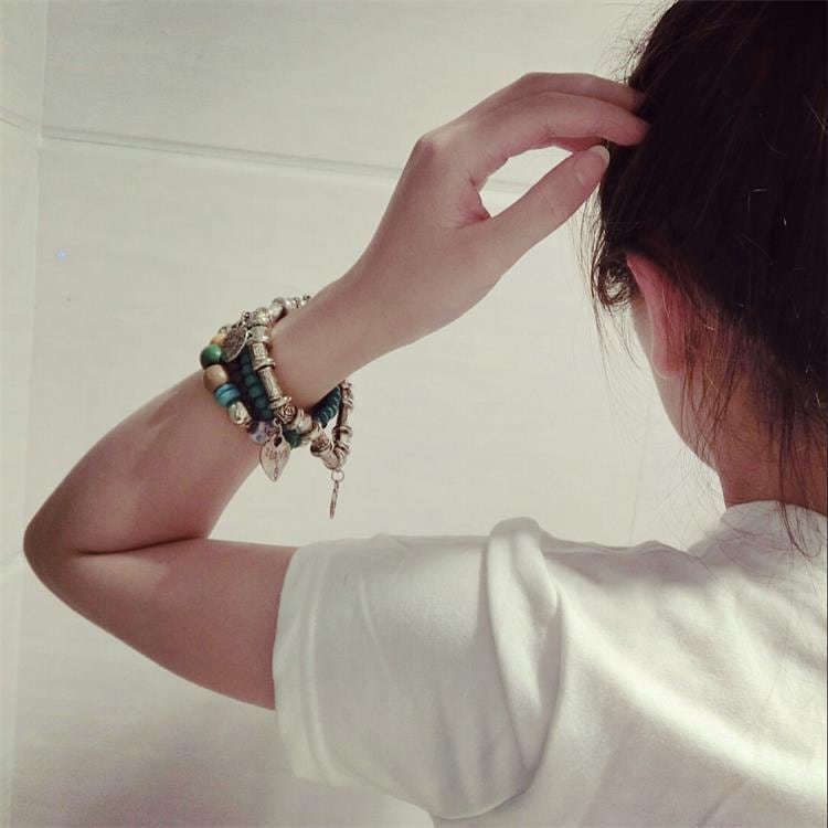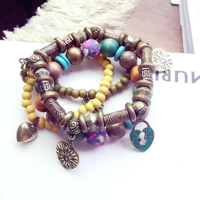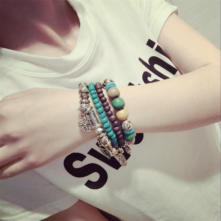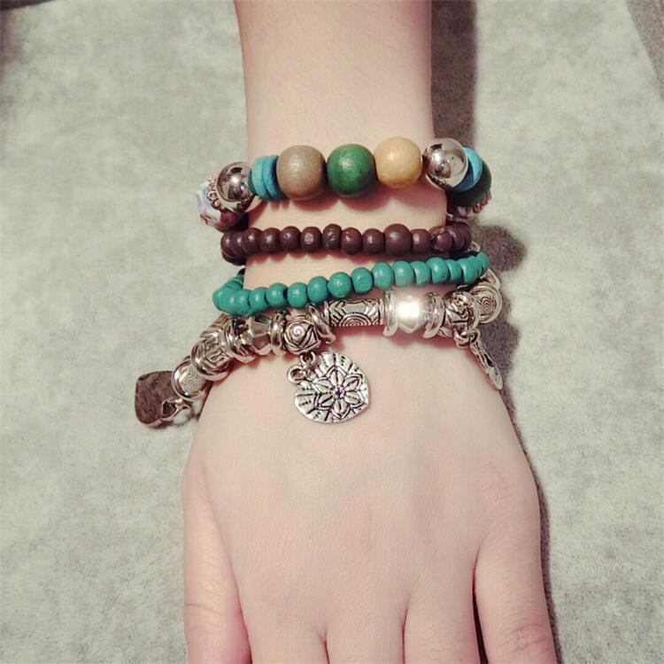 ブレスレット レディース 民族風 ボヘミアン風 ビーズ 伸縮性 多層 個性的 重ね付け カジュアル ファッション小物 普段使い レトロシルバー 腕飾り