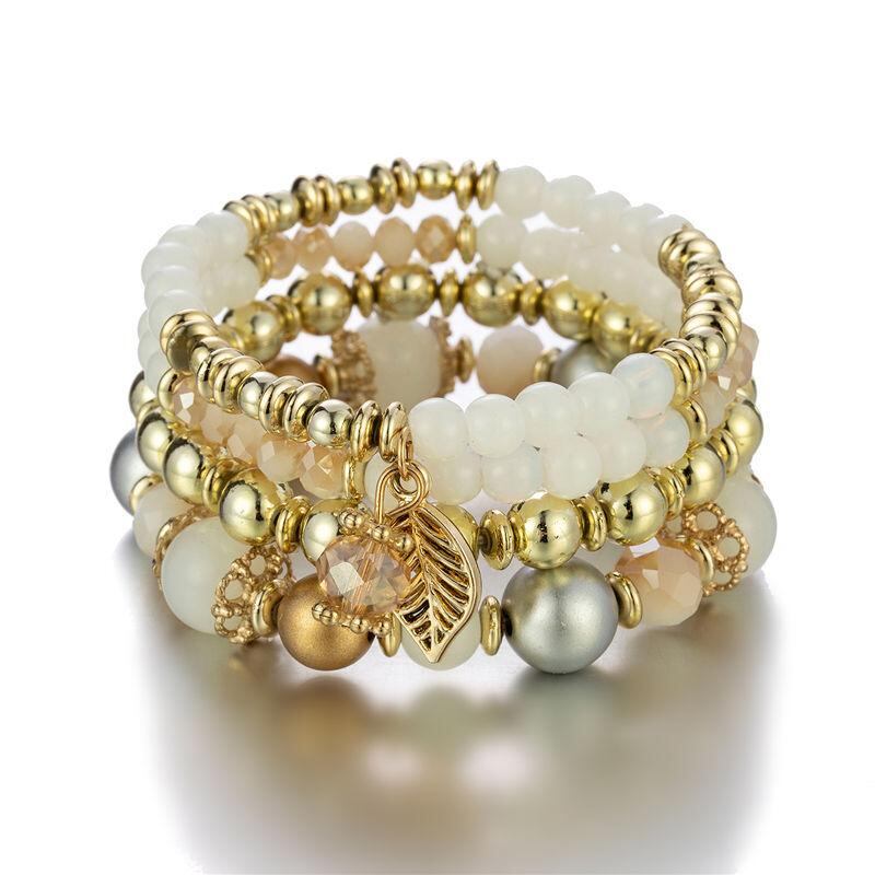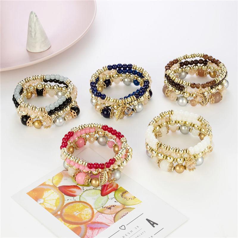 ブレスレット レディース 女性用 多層 伸縮性 リーフ 花びらモチーフ カラフル キャンディカラー ガラスビーズ ボヘミアン エキゾチック レトロ 欧米風