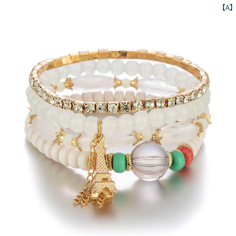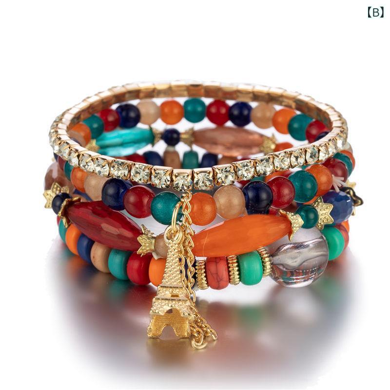 ブレスレット レディース 欧米スタイル ボヘミアン エスニック エッフェル塔モチーフ 多層 フリンジ 腕飾り アクリル ガラスビーズ レトロ 異国情緒 旅行 リゾート 普段使い ベージュ ダークミックス ブラウン ブラック