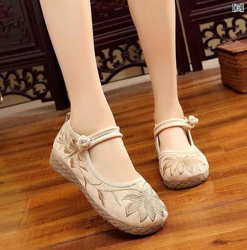 レディース フラットシューズ 民族風 エスニック 刺繍 蓮の花 コットン布製アッパー ソフトソール 快適 ウォーキング 普段使い ラウンドトゥ 浅履き ローヒール ゴム底 滑り止め Tストラップ バックル付き コットンリネン中敷き グリーン リネンカラー