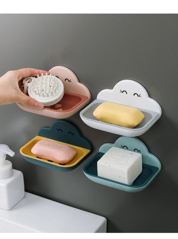 石鹸置き ソープディッシュ 穴あけ不要 貼るだけ 壁掛け 吸盤式 2段 ダブル 水切り 雲型 クラウドデザイン 収納ホルダー 浴室 洗面所 お風呂 バスルーム ホワイト ピンク ライトブルー ダークブルー