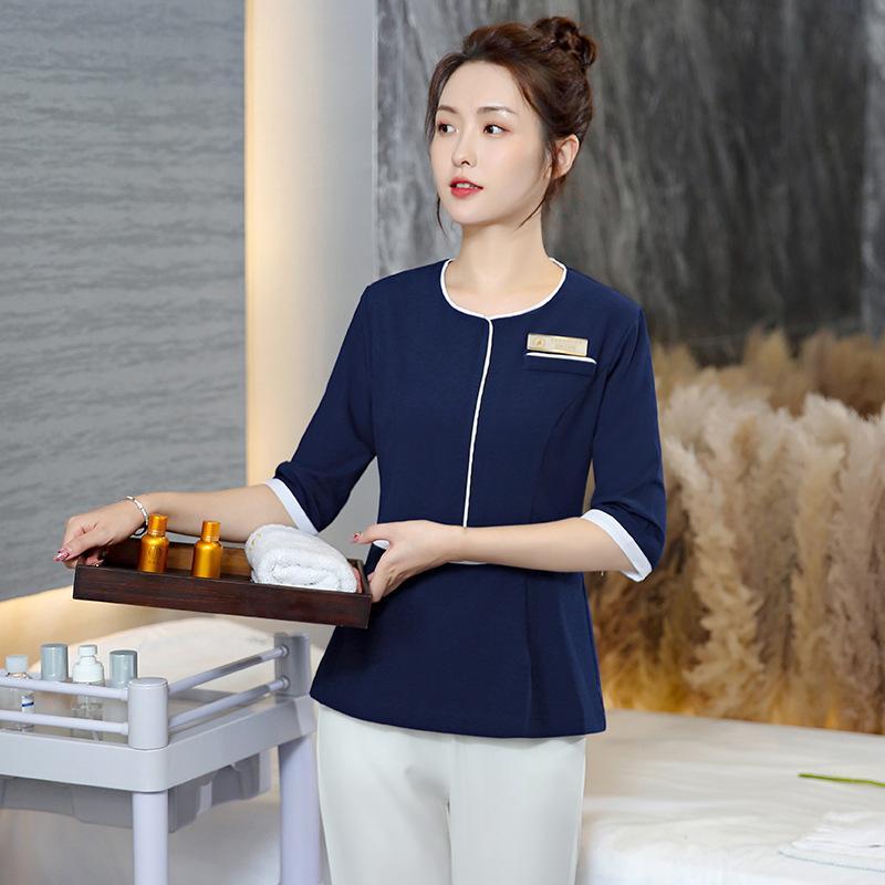 制服 レディース 女性用 エステティシャン 美容師 施術服 美容院 エステサロン 業務 ウエストシェイプ スリムフィット 上品 エレガント 七分袖 吸湿速乾 ポリエステル ポリウレタン セットアップ 上下セット