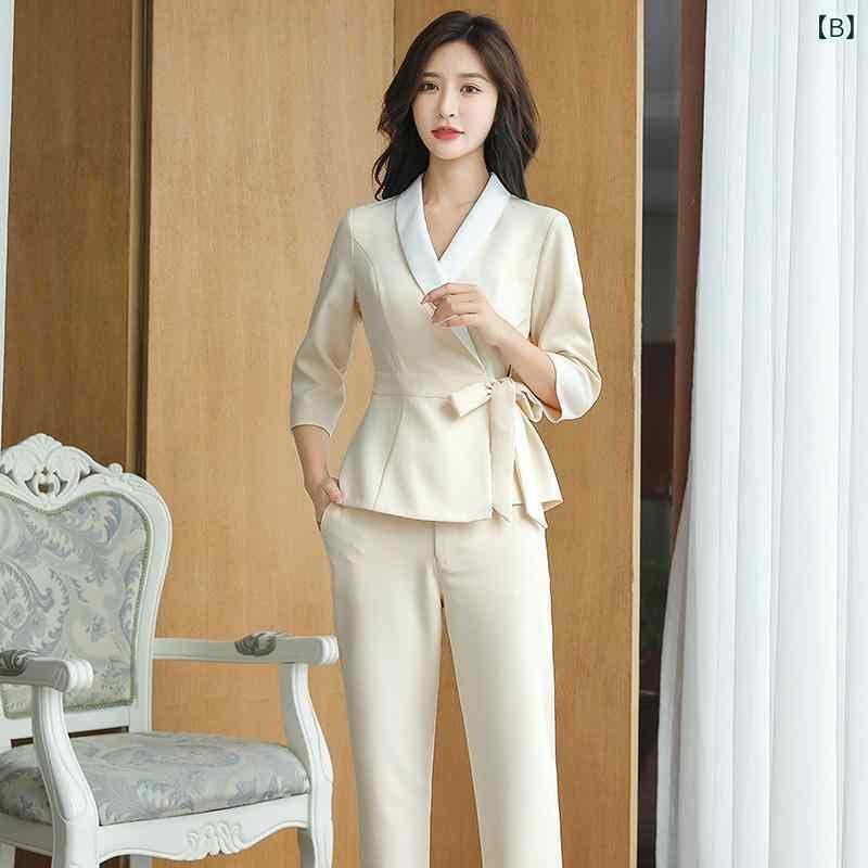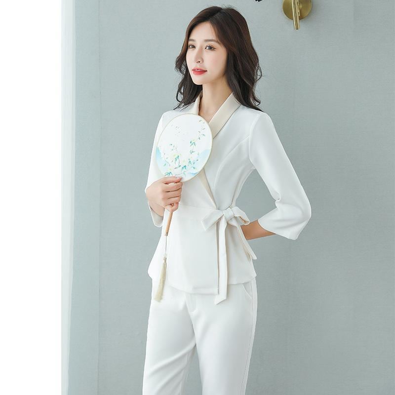 ユニフォーム レディース 美容師 エステティシャン セラピスト 施術用 サロン スキンケア リラクゼーション フットケア 作業着 高級感 吸湿速乾 4WAYストレッチ 斜め襟 七分袖トップス 九分丈パンツ セットアップ 春 秋 冬