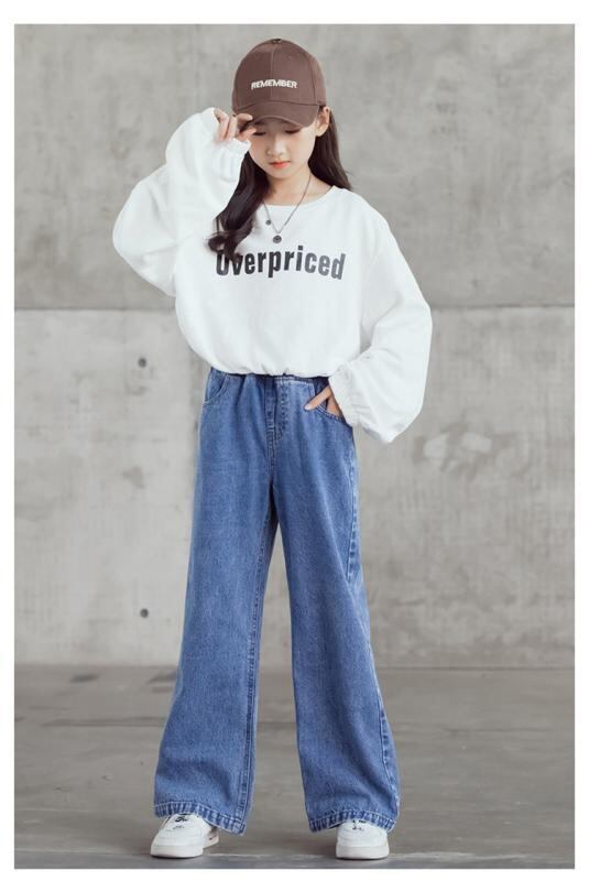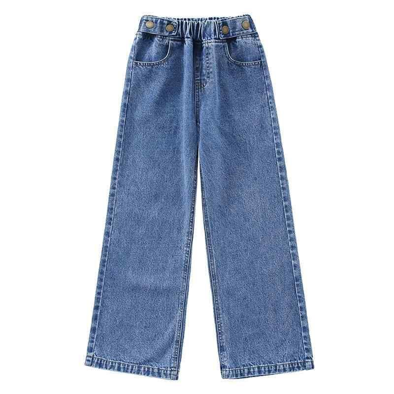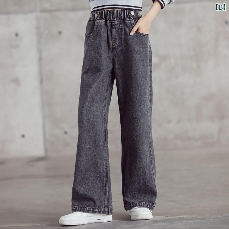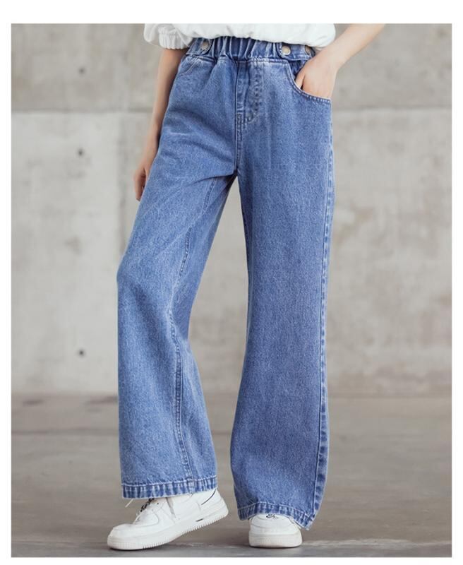 デニムパンツ 女の子 キッズ ジュニア ワイドパンツ ストレートパンツ ボトムス ウエストゴム ミドルウエスト 韓国ファッション 綿 コットン 柔らかい ソフト 普段使い 通学 春夏秋 ブルー ダークグレー