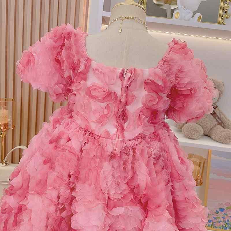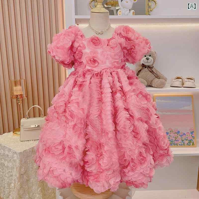 ワンピース 女の子 ピンク 小花柄 チュール ボリューム プリンセスドレス 半袖 フリル ポリエステル キッズ 女児服 子供服 お出かけ 発表会 フォーマル かわいい