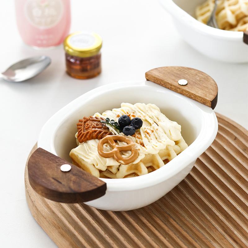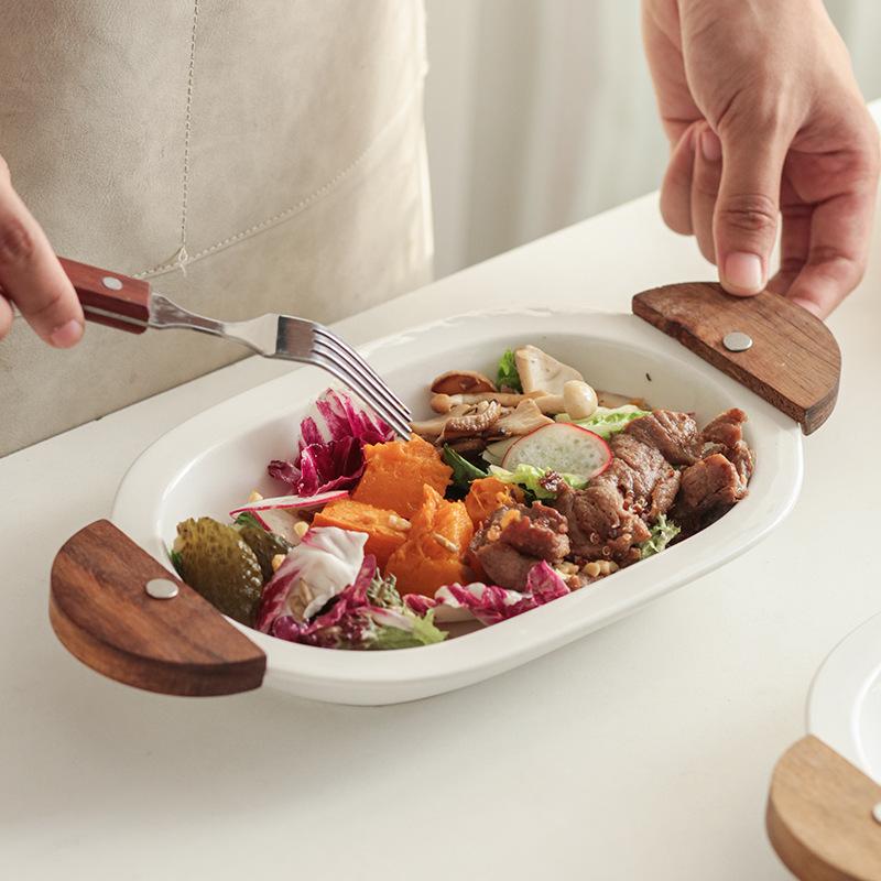 ボウル プレート 陶磁器 オーバル 楕円形 両耳 ダブルハンドル アカシアウッド製取っ手 無地 単色 釉薬仕上げ 一人暮らし用 サラダボウル フルーツ皿 デザートボウル ご飯茶碗 シンプル モダン スタイリッシュ おしゃれ