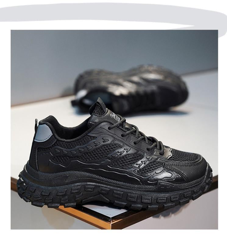 スニーカー メンズ 男性用 安全靴 作業靴 ダッドシューズ 夏用 通気性 耐摩耗 滑り止め タイヤソール 厚底 身長アップ PUレザー メッシュ ゴム底 スポーツ 普段使い カジュアル ウォーキング ランニング ブラック 黒