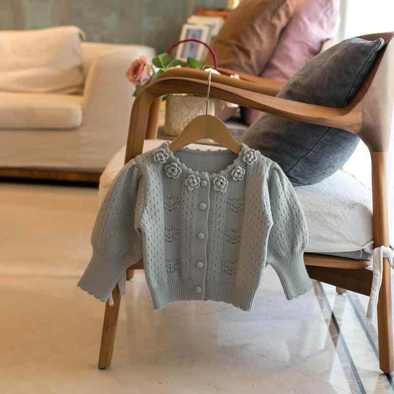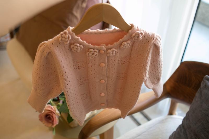 カーディガン キッズ 女の子 立体小花柄襟 長袖 ボタン アクリル 綿混 ソフトタッチ 丸襟 秋冬 韓国風 カジュアル 普段使い お出かけ アイボリー ピンク ライトブルー