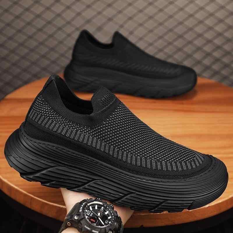 スリッポン メンズ 男性用 フライニット メッシュアッパー 通気性 軽量 スポーツ カジュアルシューズ デイリーユース 普段使い 厚底 ローカット ラウンドトゥ ブラック カーキ