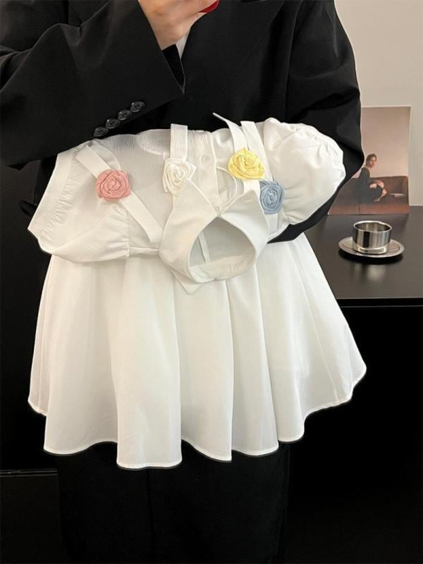 ワンピース 女の子 ガールズ 夏物 パフスリーブ 韓国風 スクール風 カレッジスタイル おしゃれ 上品 ホワイト 白 ポリエステル プリンセス Aライン 柔らか肌触り 手編み花飾り 園児 小学生