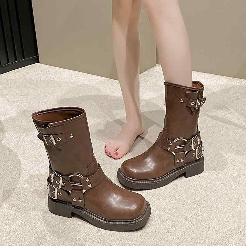 ショートブーツ レディース スクエアトゥ 太ヒール チャンキーヒール プルオン ミドル丈 ジョッキーブーツ ウエスタンブーツ レトロ ヴィンテージ カジュアル 脚長効果 安定感 耐摩耗性 フェイクレザー 黒 ダークブラウン