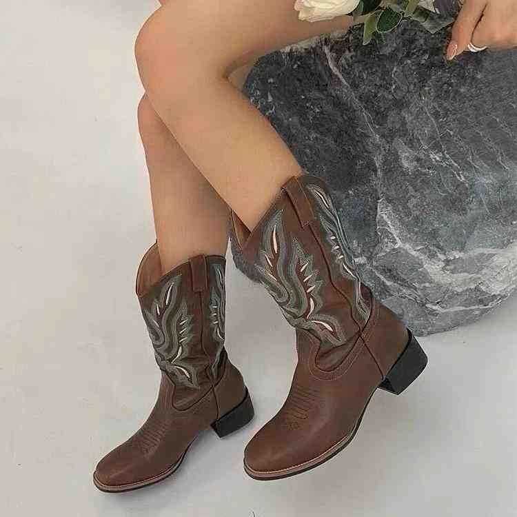 ウエスタンブーツ レディース レトロ 刺繡 ブラウン チャンキーヒール ショートブーツ スクエアトゥ ミドル丈 ミドルヒール マイクロファイバー フェイクレザー 豚革 通気性 耐摩耗 衝撃吸収 カジュアル ステッチ エスニック柄 抽象柄