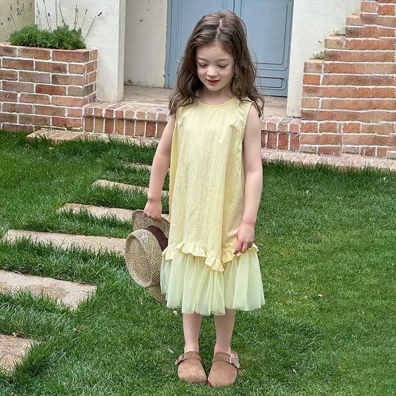 ワンピース 女の子 リゾート バカンス お出かけ 普段着 フェアリー プリンセス かわいい ノースリーブ チュール切り替え Aライン 綿混 コットン ソフト 涼しい 快適 イエロー 黄色
