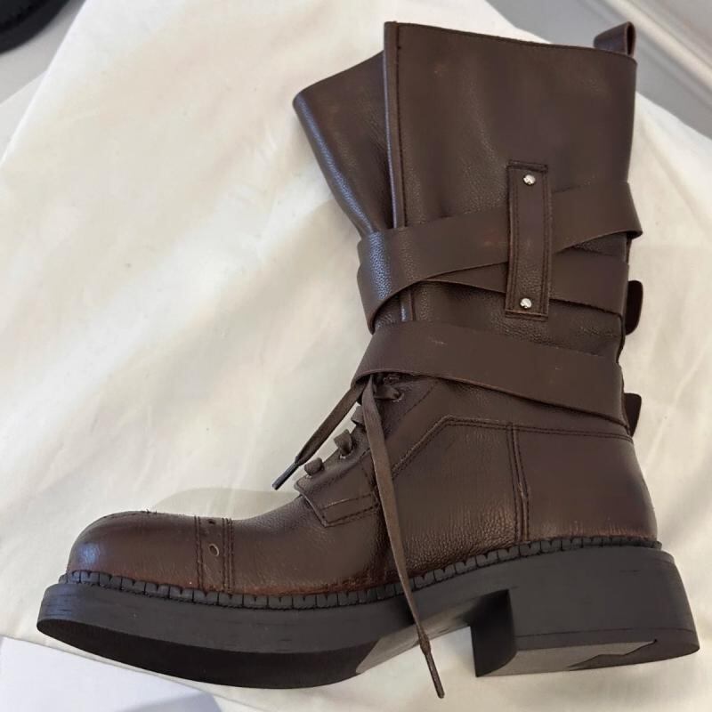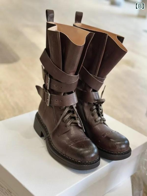ライダーブーツ レディース 大きいサイズ ロングブーツ 太ヒール ミドルヒール ラウンドトゥ エンジニアブーツ ウエスタンブーツ レトロ ヴィンテージ レザー調 バックル付き