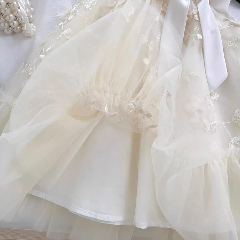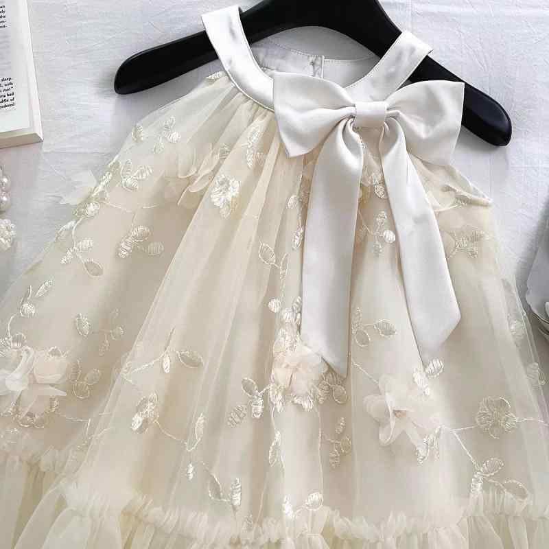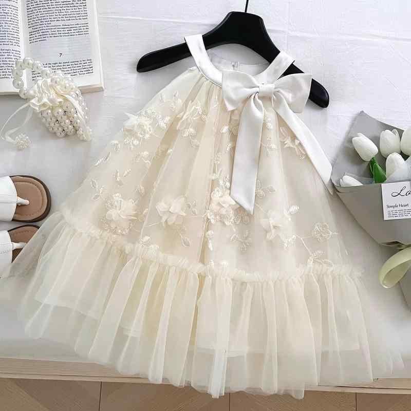 ワンピース 女の子 キッズ ベビー ガールズ ホルターネック プリンセス風ドレス かわいい スウィート 立体花 フラワー ノースリーブ Aライン ナイロン素材 柔らかい アイボリー 刺繍 メッシュ チュール 夏 サマー