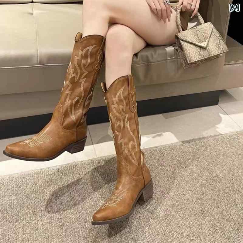 ブーツ レディース ウエスタンブーツ カウボーイブーツ ライダーブーツ ロングブーツ 夏用 レトロ クラシック 刺繍 太ヒール チャンキーヒール 牛革 レザーアッパー 豚革裏地 ブラウン ブラック ホワイト
