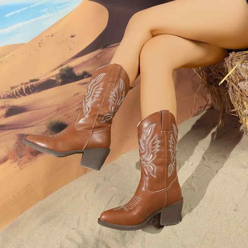 ウエスタンブーツ レディース ロング丈 レトロ 騎士ブーツ ポインテッドトゥ 太ヒール ミドルヒール 脚長効果 通勤 PUレザー 春夏秋 ブラック ダークブラウン