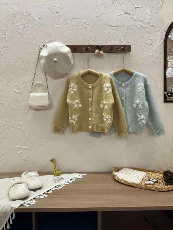 ニットカーディガン 女の子 ガールズ 韓国風 立体花柄刺繍 手編み風 秋冬 ラウンドネック 柔らかい ポリエステル混紡 長袖 羽織り 通園 通学 普段使い カジュアル かわいい イエロー ブルー