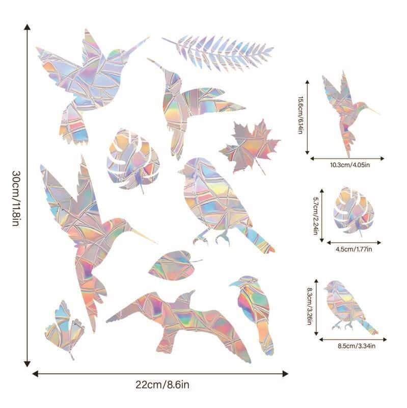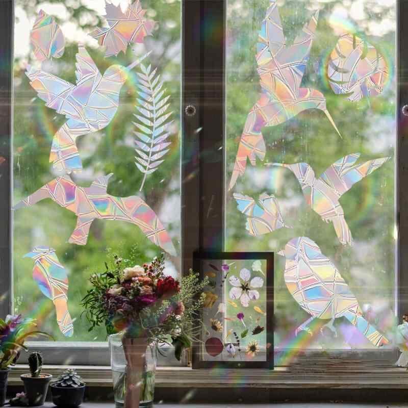 窓用フィルム サンキャッチャー 静電気吸着 虹色効果 光拡散 カラフル 小鳥 葉柄 ボタニカルデザイン PVC素材 リビング 寝室 部屋用 プライバシー保護 日差し対策 窓飾り