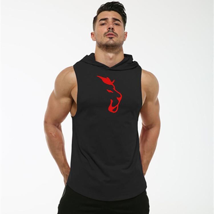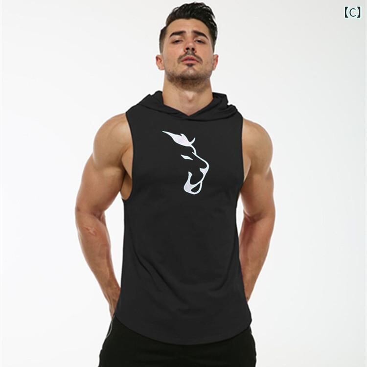 スポーツタンクトップ メンズ 欧米風 フィットネス トレーニング ノースリーブ フード付き タイトフィット 接触冷感 コットン 吸汗速乾 ストレッチ ウルフヘッドプリント ラウンドヘム 夏用 スポーツウェア ブラック ホワイト レッド