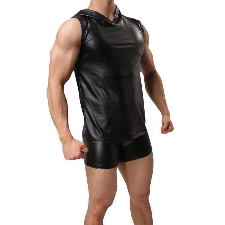 ベスト メンズ エナメルレザー 光沢 フード付き ノースリーブ ワイドショルダー ポリエステル フィット セクシー コスプレ 仮装 欧米風 衣装 イベント ナイトウェア