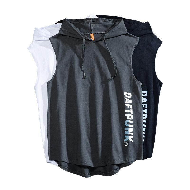 タンクトップ メンズ フード付き ノースリーブ パーカー スポーツ 運動 ジム トレーニング ストリートファッション ヒップホップ ゆったり ビッグシルエット アルファベットプリント コットン 綿 ラウンドヘム 男性用